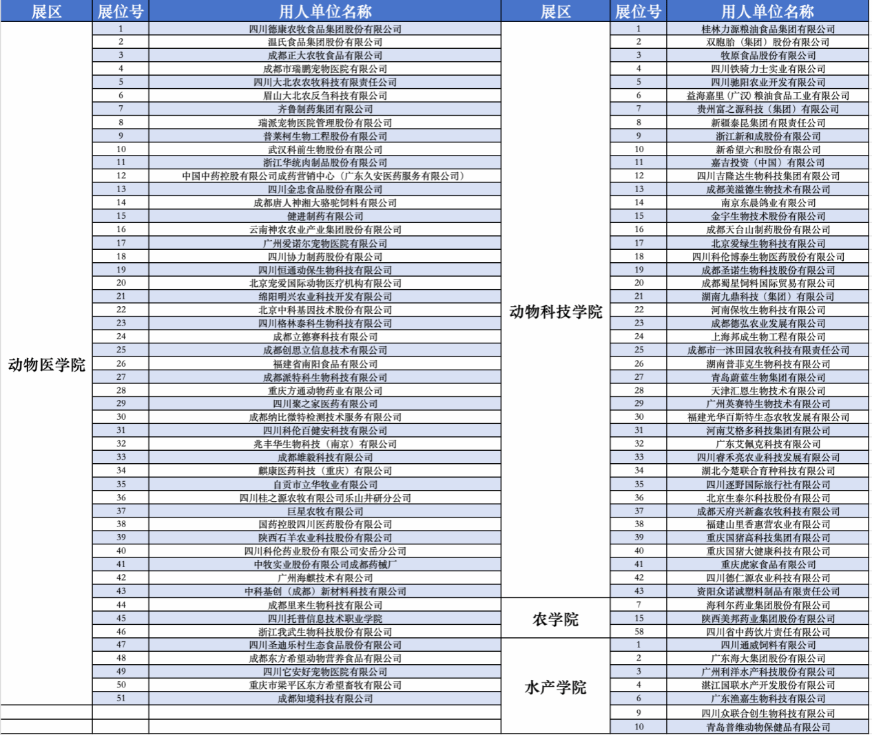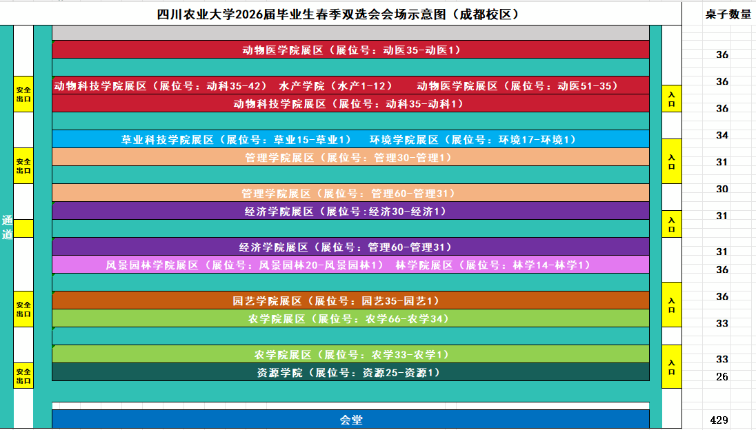 四川农业大学2026届毕业生春季双选会(成都校区)将于2026年4月9日(周四)9:00——13:00在会堂(风雨操场)举行 ,现将场地划分示意图和参会单位信息表挂至院网(见附件1和附件2),请各位同学下载查看。