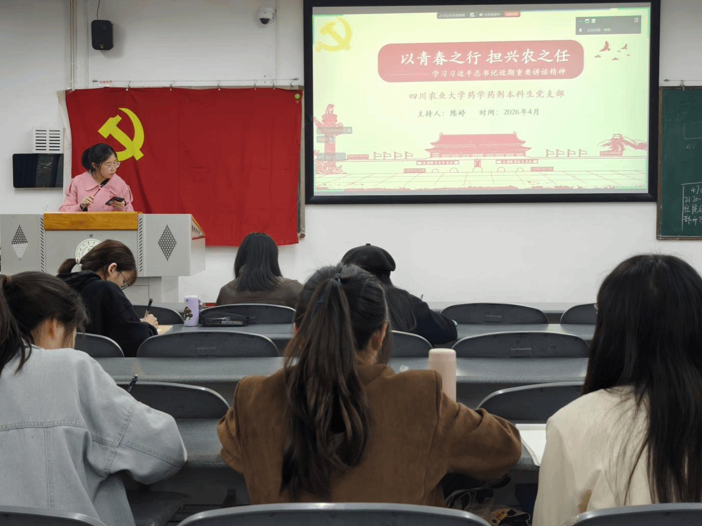 “功成不必在我,功成必定有我——作为动医学子,我们该如何理解这句话?”4月8日,在药学药剂本科生党支部组织生活会上,史佩菱同志围绕这一命题分享了自己的感悟。本次会议以“以青春之行,担兴农之任”为主题,支部45名党员全员参与,通过理论学习、光影铸魂、互动研讨、知识竞答等环节,引导青年党员学思用贯通、知信行统一,切实将理论学习成果转化为报国兴农的实际行动。