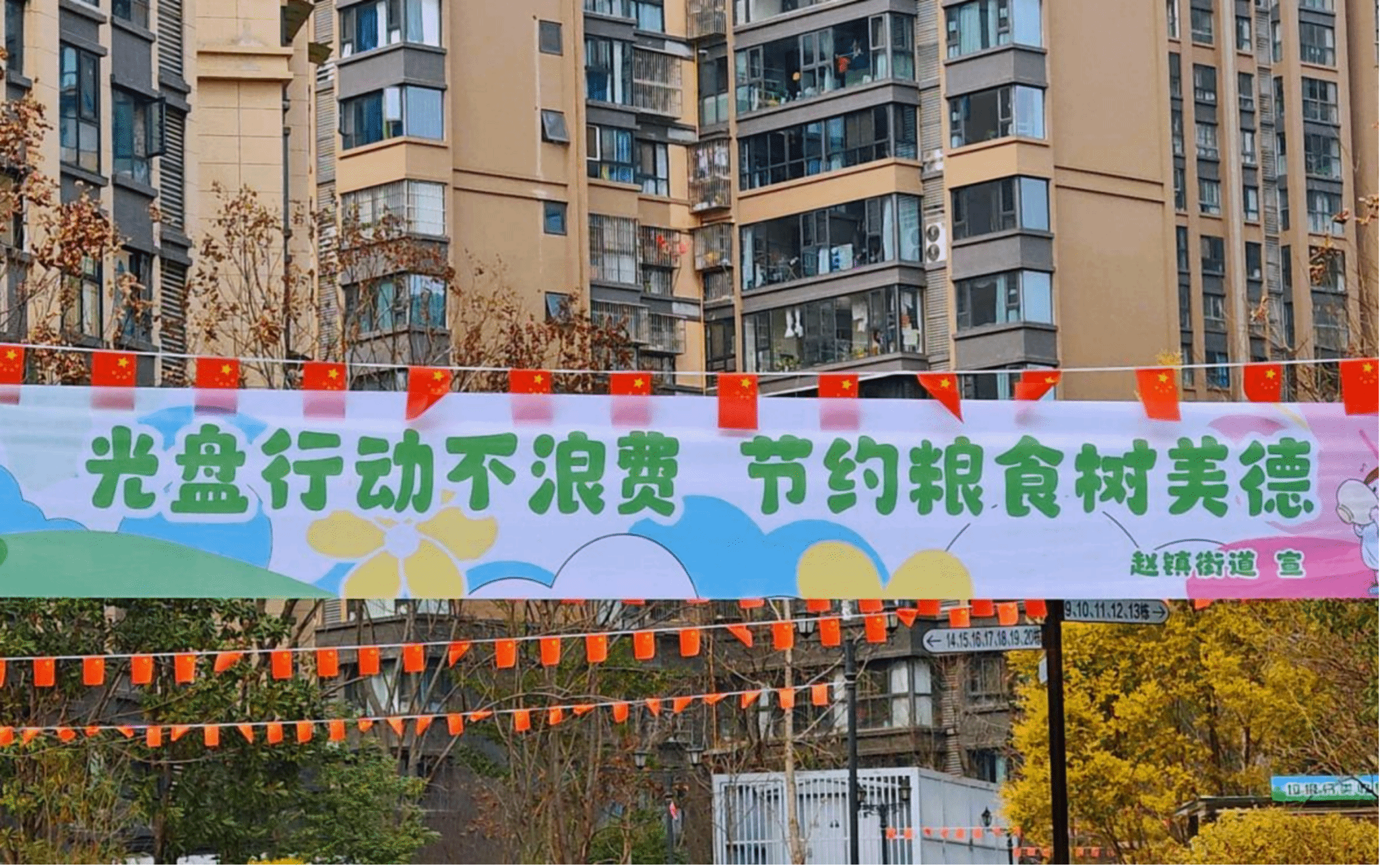 (图为队员在某社区拍摄的光盘行动、节约粮食宣传横幅)