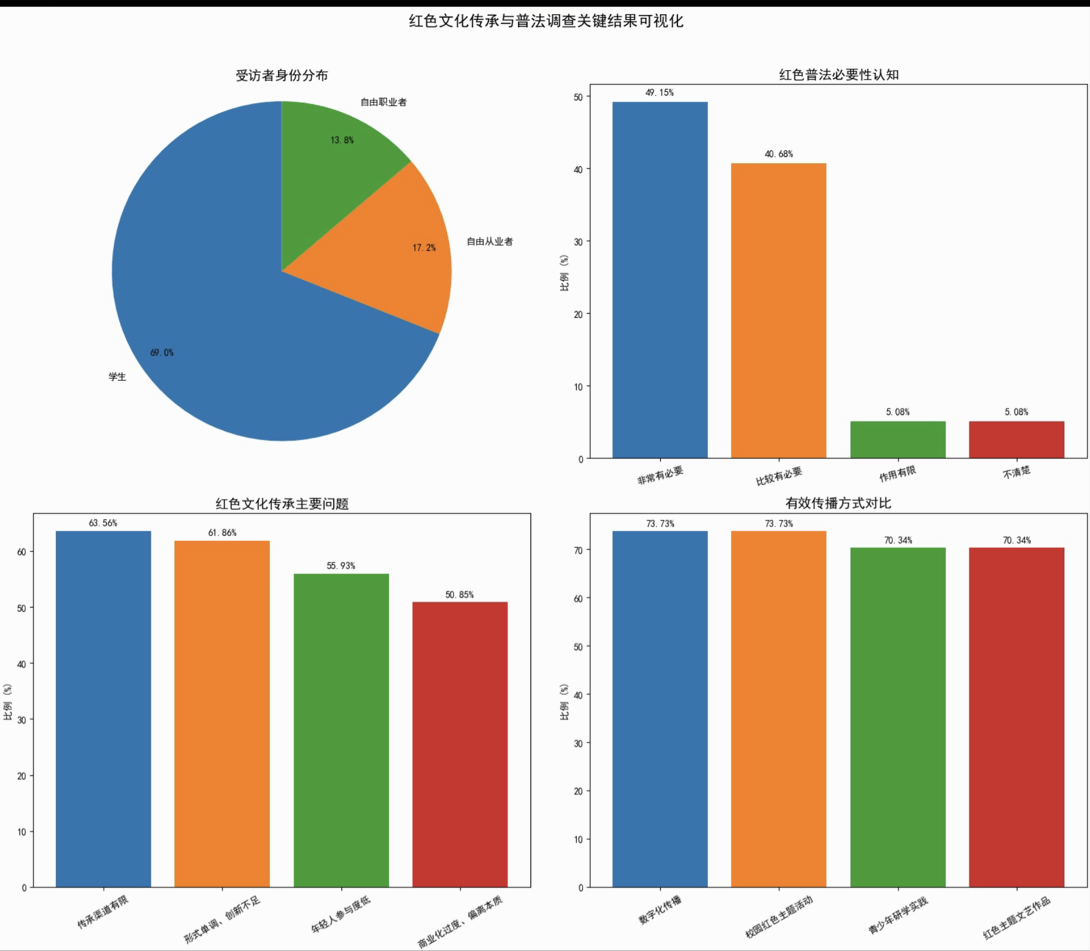 为深入把握青年一代对红色文化传承与普法教育的认知现状,引导广大青年在社会实践中坚定理想信念、增强法治意识,四川农业大学动物医学院“红色基因,薪火相传”实践队一项以“红色文化与普法认知”为主题的社会实践调研于1月21日通过线上线下相结合的方式进行红色调研实践活动,并顺利完成数据分析工作,收集了大量青年群体的真实反馈,为新时代红色基因传承与青少年法治教育提供了有益参考。