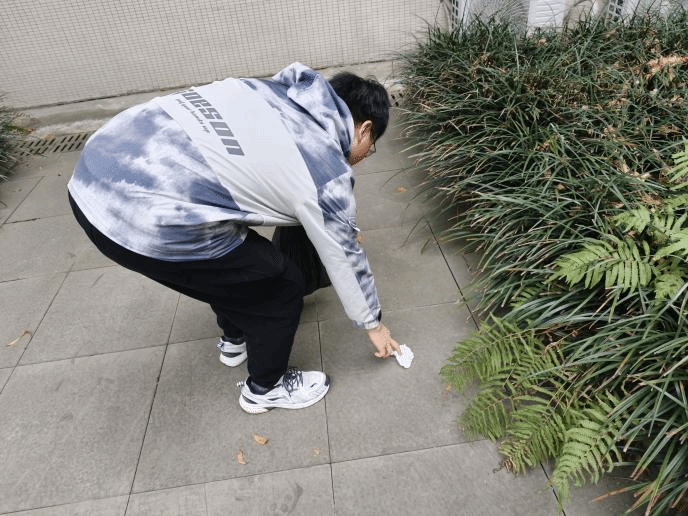 校园里那些一闪而过的角落,往往是垃圾的“藏身之处”:被风带来的纸团、塑料袋,或是被人遗忘的水瓶等,日积月累便成了影响校园环境的小烦恼。3月11日,支部成员曾章棣在清扫停车区域角落时,发现了被碾碎的易拉罐,他深刻意识到,车辆的乱停乱放不仅会形成卫生死角,更会造成视野盲区,埋下安全隐患。“我随手弯腰捡起掉落的纸团时,路过的同学也会会心一笑,自己心里也暖暖的。”曾章棣感叹道。