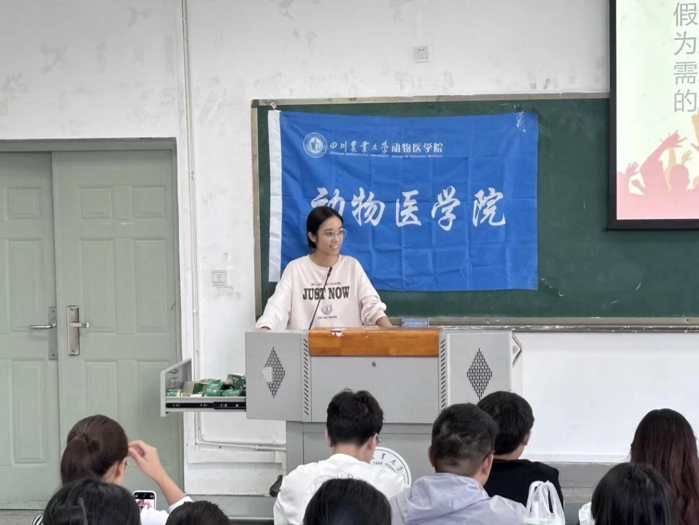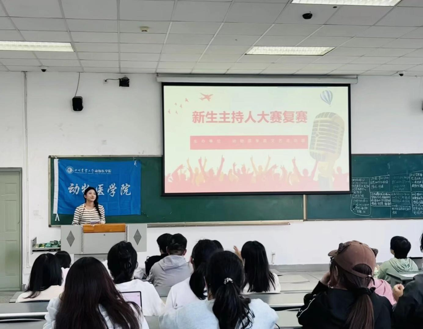 初赛环节中,选手们依次登台,带来自选主题的主持演讲。有人用沉稳大气的语调营造庄重氛围讲述红色故事;有人化身校园主播,以轻松诙谐的节奏讲述动医日常。虽无统一命题,但不少参赛选手巧妙融入专业元素——从专业课的严谨到二课活动的热忱,从川农银杏大道的秋景到探讨兽医使命的担当,这些选题的背后是对学院文化的深情认同。