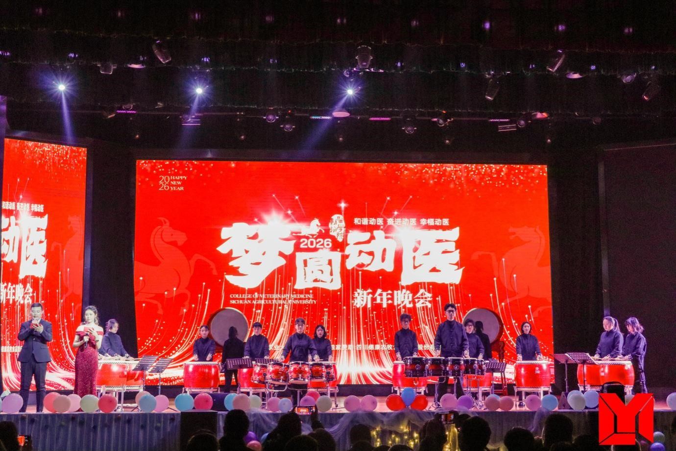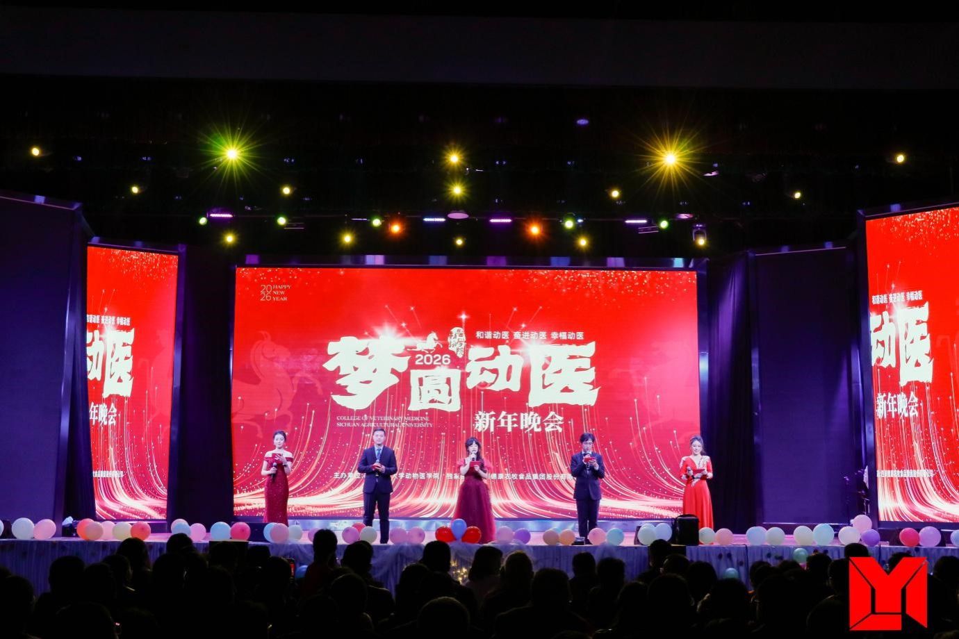 12月26日晚,我院“梦圆动医”2026新年晚会在麦立方隆重举行。该晚会由四川德康农牧食品集团股份有限公司独家赞助。学院院长陈舜、党委书记侯维,校科技处副处长张沙秋,学院副院长左之才、党委副书记宋三多、副院长陈正礼等领导与学院全体教职工及全体本硕博学生欢聚一堂,共迎新年、共赏盛宴。