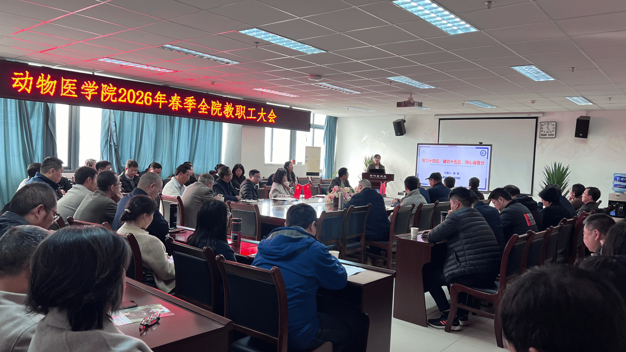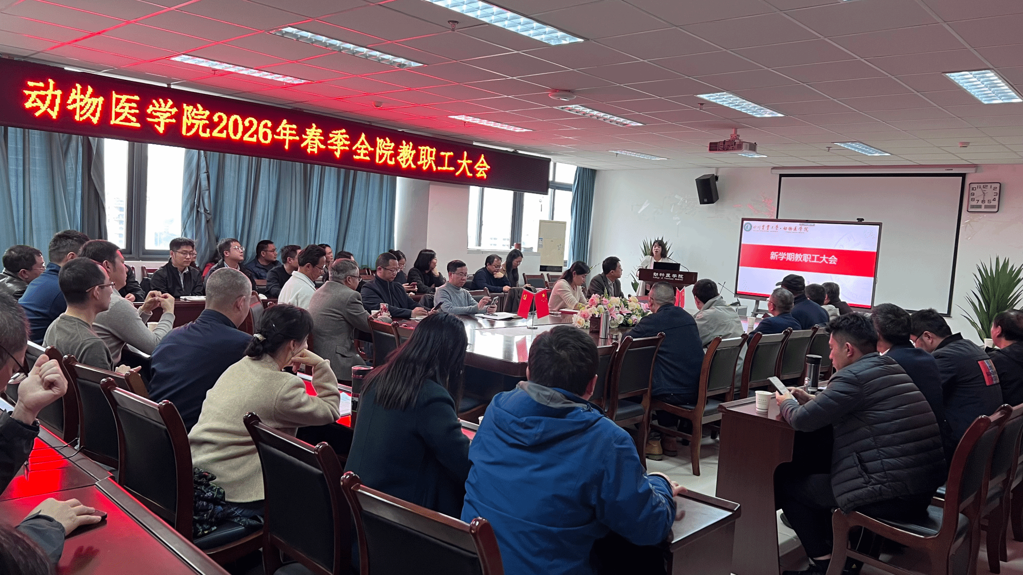 3月3日,动物医学院在成都校区7-1109会议室召开2026年春季新学期全院教职工大会,深入学习贯彻习近平总书记近期重要讲话精神,传达学习省委、学校重要会议和文件精神,研究部署学院2026年重点工作,学院班子成员、全体教职工参会,会议由学院党委书记侯维主持。