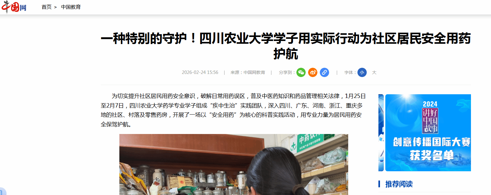 “此次活动是药学学子用专业知识服务社会的一次生动实践,更是对居民用药安全的一种暖心守护。”四川农业大学相关负责人表示,未来,他们将继续秉持专业初心,持续开展安全用药科普,推动安全用药、合理用药观念深入人心,为中医药行业高质量发展贡献青春力量。