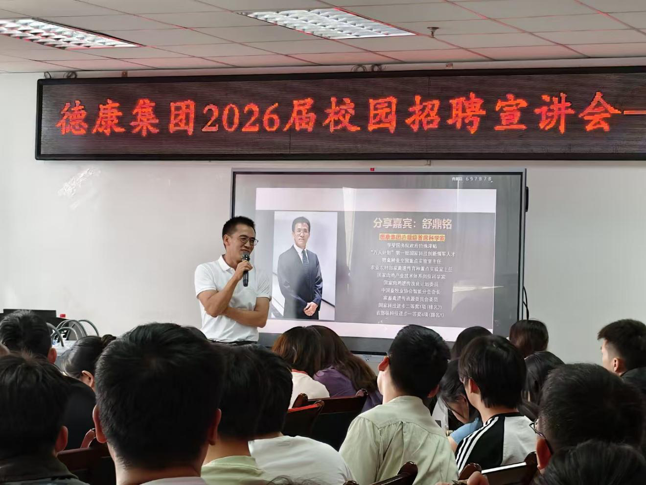 在“请进来”的同时,学院深耕“医路领航”品牌内涵,将招聘宣讲与价值引领相结合,邀请企业高管、技术专家与优秀校友多维度分享行业见解与成长故事。德康集团首席科学家舒鼎铭博士则从行业发展态势出发,分析现代农牧业对人才能力的新要求,为学子规划职业路径提供前瞻性指导。温氏集团西南养猪公司技术总监、优秀校友陈龙则以自身从求学到成为产业技术总监的奋斗历程,为面临“就业、考研、考公”多重选择的学子拨开迷雾,指引方向。牧原集团创新推出“人才嘉年华”招聘路演活动,组织多个部门的负责人现场设点,与毕业生展开面对面、一对一的深入交流,帮助学生在轻松互动中全面了解企业架构与岗位特点。