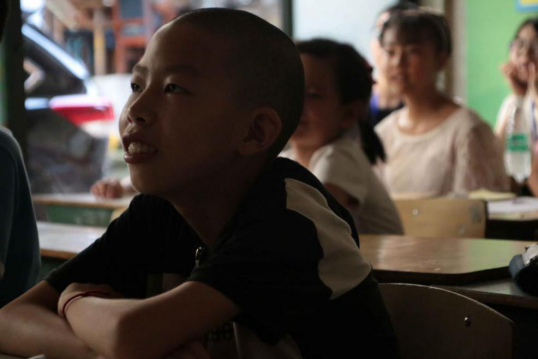 志愿者们从“言语警报、视觉警报、独处警报、触碰警报、束缚警报”这几个方面层层递进,在人体示意图上用红点标出不可以触碰的地方,绿点标出可以触碰的地方,教孩子们辨别什么是人与人之间正常的触碰。图为孩子们认真听课。